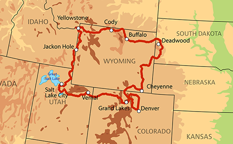Routes de montagne, virages, rivières. Nous traverserons Bridger National Forest et Caribou National Forest. Plaisir garanti ! Arrivée dans le Wyoming, pays des cow-boys. Snake River, Jackson Hole et ses saloons, répondent à tous les clichés des villes de l'ouest américain. Héritage western très présent. En 1985, la vallée de Jackson Hole fut employée comme décor du film Rocky 4 lorsque Rocky était supposé s’entraîner en Sibérie. Harrison Ford et Sandra Bullock on sont des habitants d’honneur.