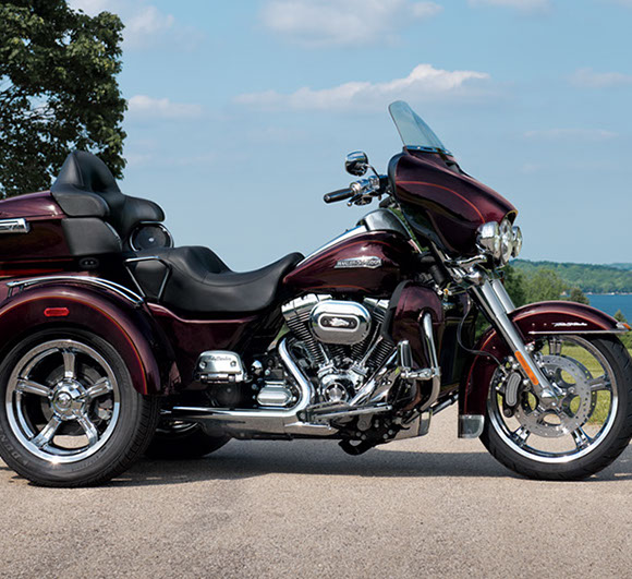 Voilà la première Harley Davidson conductible sans le permis moto. Ce Trike (3 roues avec deux roues arrière), reprend une base d'Electra Glide avec son moteur offrant un généreux couple. Plus besoin de mettre le pied au sol à l'arrêt et la marche arrière électrique est là pour se sortir d'un stationnement. Le Tri Glide est fait pour les grands espaces où l'on cuise dans le plus grand des conforts, abrité derrière son vaste pare-brise, contrôlant les instruments de bord avec GPS. Le passager bénéficie d'un vrai fauteuil et madame n'aura pas de problème pour loger son surplus de bagage dans la soute de 150 litres située entre les deux roues arrière qui s'ajoute au top-case déjà bien généreux. Le Tri Glide exige un peu de force à base vitesse avec une roue avant très directive, mais devient véritablement plaisant sur route.